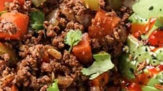 Ingredients: 1 lb ground beef 2 medium sweet potatoes, peeled and diced 1 avocado, diced 1 egg (for topping) 1–2…