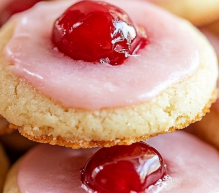 - Scoop 1 tablespoon of dough, press a small pit into the center, and place half a maraschino cherry inside. Fold dough around the cherry to form a ball.