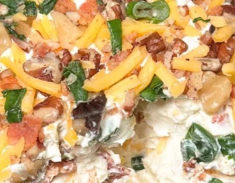 - In a small bowl, mix pecans, ¼ cup shredded cheddar, ¼ cup bacon bits, and 2 Tbsp green onions. Set aside.
