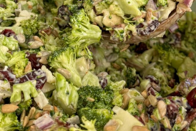 In a large bowl, mix together the broccoli, cauliflower, bacon, sunflower seeds, dried cranberries, and chopped red onion.