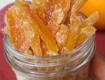 - Place the peels in a pot with orange juice, water, and sugar. Cook for 30 minutes. Turn off heat, let rest for 10 minutes, and cover with a lid.