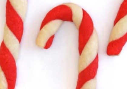 - Slice ½” × 5″ strips. Roll each strip into a rope, twist to create the red-white spiral, then bend the top to form a candy cane shape.