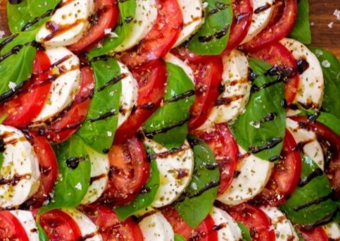 - On a large board or platter, form the bottom row of the tree by alternating and overlapping mozzarella, tomato, and basil (about 6 of each).