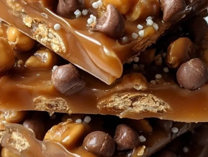 - Sprinkle butterscotch chips, chocolate chips, toffee bits, and optional peanuts over the caramel, pressing gently.