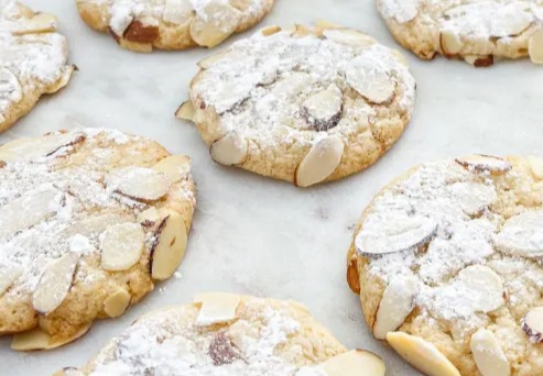 - Scoop dough (about 2 tablespoons each), roll into balls, and coat with sliced almonds.