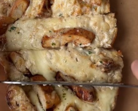 6. Slice bread in half lengthwise and spread garlic butter evenly. Spoon Alfredo sauce over the bread, sprinkle with mozzarella, and top with sliced chicken. Drizzle with additional Alfredo sauce.