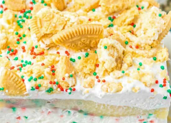 - Top with remaining whipped topping. Crush the remaining 12 cookies and sprinkle over the top along with remaining sprinkles.