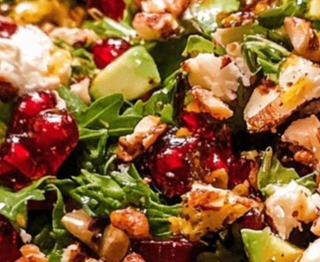 - In a large bowl, combine greens, pomegranate seeds, cranberries, apple slices, nuts, feta, and red onion.