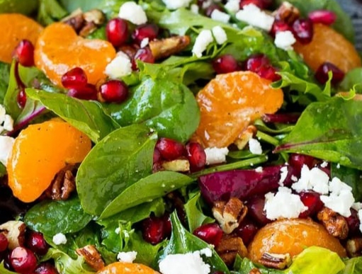 1. Add the mixed greens, orange segments, pomegranate seeds, feta, and candied pecans to a large bowl.