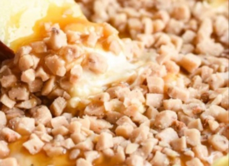 - Just before serving, spread the caramel sauce over the top and sprinkle with toffee bits.