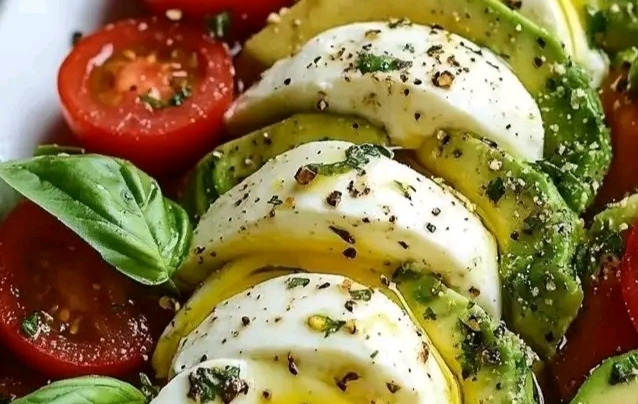 - Arrange avocado slices, mozzarella, and cherry tomatoes on a serving platter or in a shallow bowl.