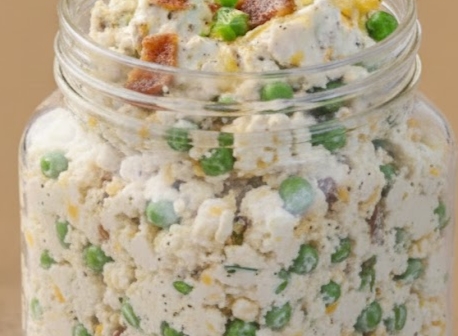 - Fold in the peas, bacon, shredded cheddar, red onion, and fresh herbs.