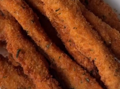 - Heat oil to 350°F (175°C). Fry chicken strips in batches for 2–3 minutes, or until golden, crispy, and the internal temperature reaches 165°F.