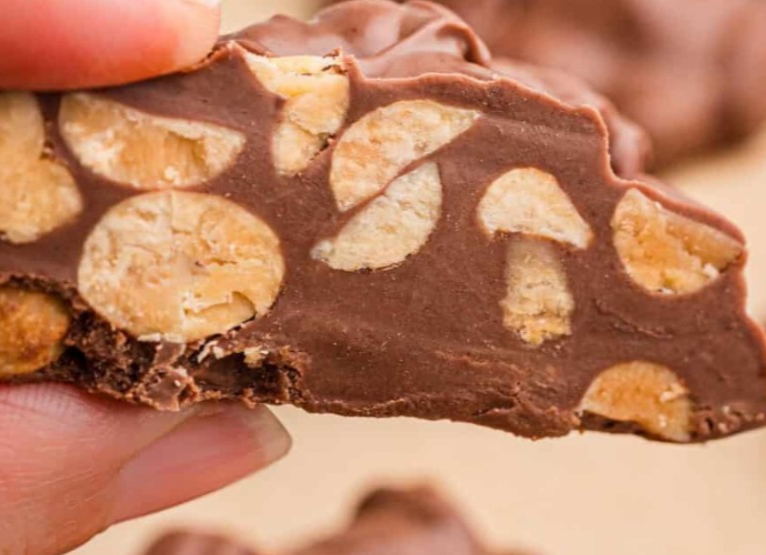 - Add peanuts to the bottom of the crock pot. Top with almond bark, then chocolate chips.