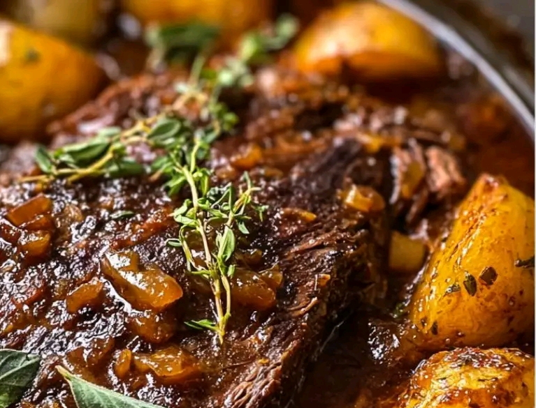 Place the sliced onions and halved potatoes at the bottom of the slow cooker. Set the roast on top. - Mix the Sauce