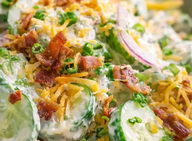 1. In a large mixing bowl, combine the diced cucumbers, shredded cheddar cheese, and crumbled bacon.