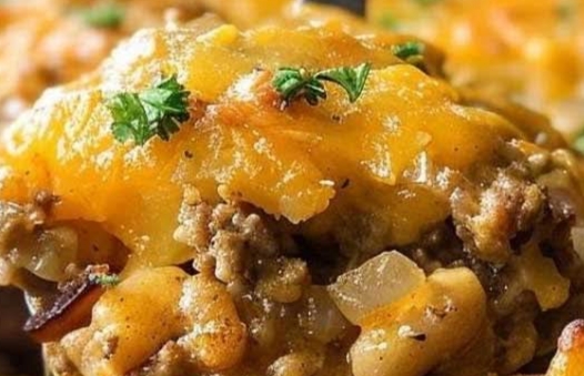 - Repeat layers with remaining potatoes, meat, soup mixture, and cheese.