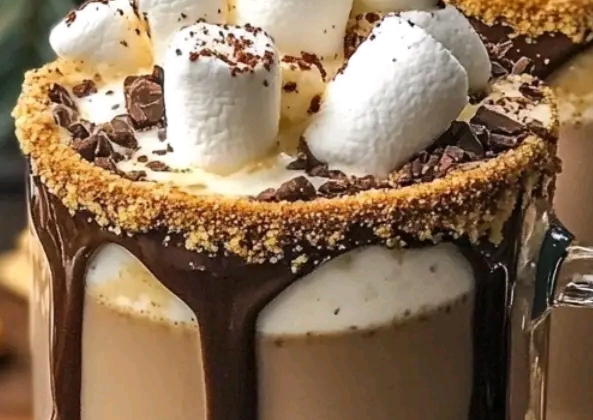 Rim each mug with chocolate syrup, then dip the rim into the graham cracker crumbs to coat. - Assemble the S’mores Cocoa