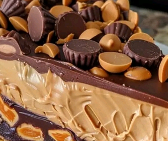 Pour the melted chocolate mixture over the peanut butter filling. Sprinkle the remaining mini Reese’s cups on top.