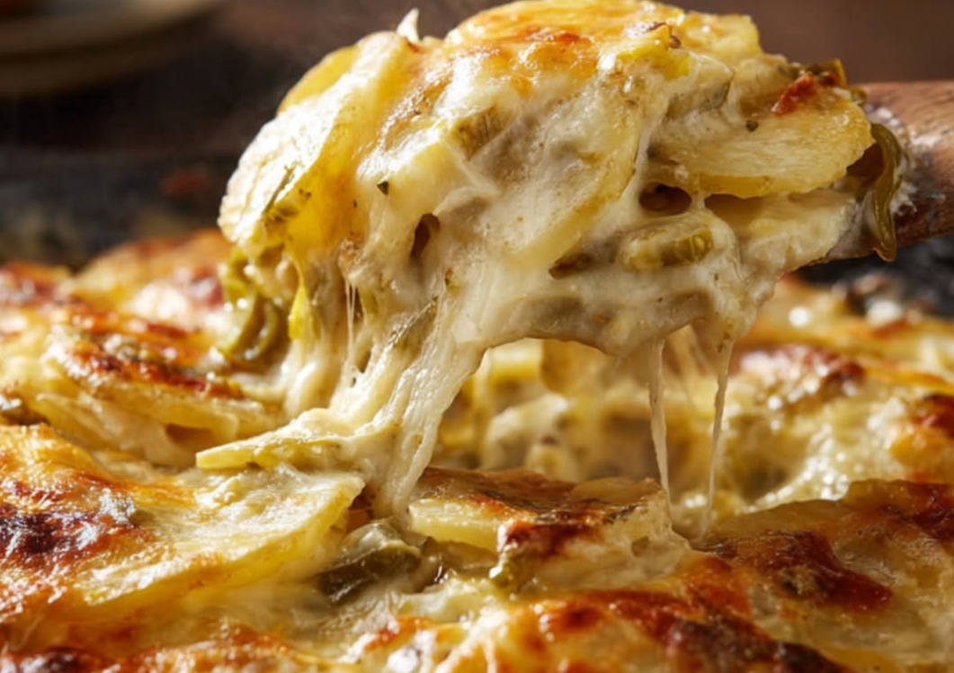 8. Repeat layers with remaining potatoes, green chiles, and cheese sauce.