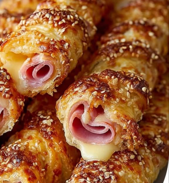 - Roll up the dough from the wide end to the tip, enclosing the cheese and ham completely.