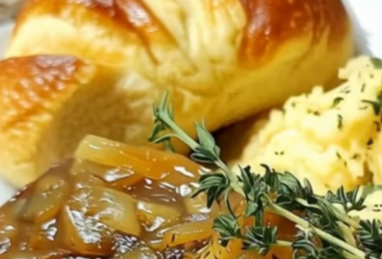 Serve hot over creamy mashed potatoes, spooning plenty of onion gravy on top. Garnish with fresh thyme or parsley and enjoy with warm dinner rolls or bread.