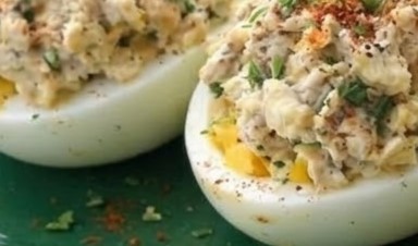 • In a bowl, mix the egg yolks, tuna (or chicken), mayonnaise, mustard, celery, green onion, salt, and pepper.