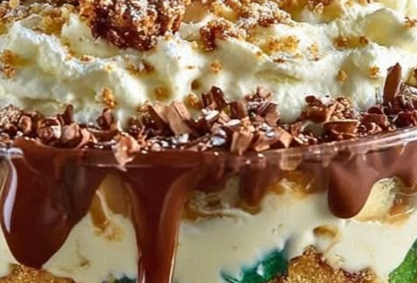 Spread a layer of the caramel mixture over the cake and jelly. Repeat the layers until the bowl is full.