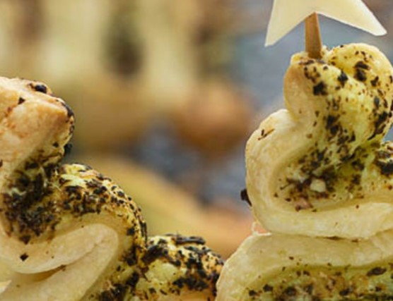3. Spread the basil pesto evenly across the pastry using a spoon or spatula.