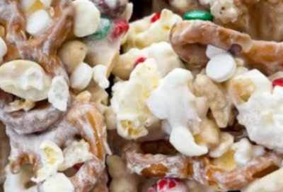 - Add Chex mix, popcorn, pretzels, and peanuts to a large bowl.