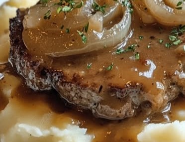 9. slice the steak against the grain, top with caramelized onions, and serve with mashed potatoes.