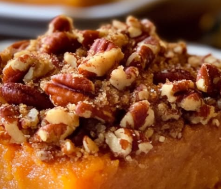 - Sprinkle the pecan mixture evenly over the sweet potato base.