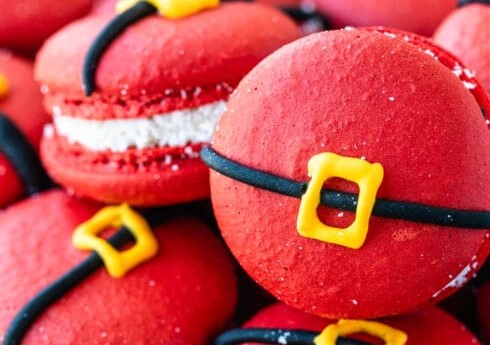 - Macaron Shells: Sift almond flour and powdered sugar together. Heat egg whites with sugar over a simmering pot just until sugar melts. Whip to stiff peaks. Fold in dry ingredients and red coloring until batter flows like thick lava. Pipe circles, tap trays, pop bubbles, and rest until dry. Bake at 300°F (about 15–20 minutes). Cool completely.