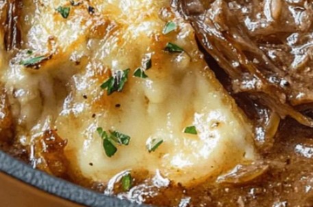 6. Sprinkle flour over onions and stir to coat. Deglaze with wine, then add beef stock and stir well.