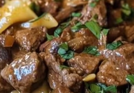 8. Serve over cooked egg noodles and garnish with fresh parsley.