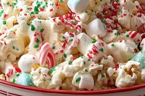 - Sprinkle crushed peppermint and sprinkles over the mixture and toss lightly.