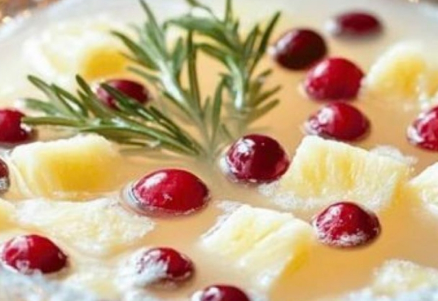 - In a large punch bowl, combine the white cranberry juice, pineapple juice, and coconut water (or lemon-lime soda). Stir well.