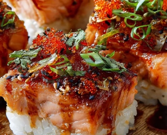 - Spread the salmon mixture evenly over the rice.