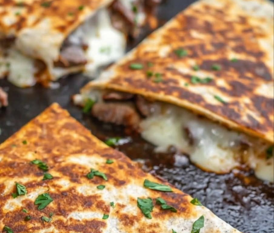 - Lay a tortilla flat, sprinkle cheese, add steak and onions, then top with more cheese and another tortilla.