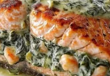 - Cut pockets into salmon fillets and stuff with the spinach mixture.