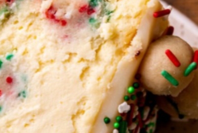 - Finish: Pour ganache over chilled cheesecake. Freeze 10 minutes. Top with remaining cookie dough balls and sprinkles.
