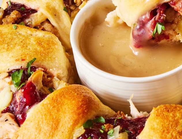 Step 2: Spread the mashed potatoes over the wide ends of the triangles, forming a ring of filling. Top with stuffing, shredded turkey, and cranberry sauce. Fold the pointy tips of the dough over the filling toward the center. There will be small gaps where the filling shows.