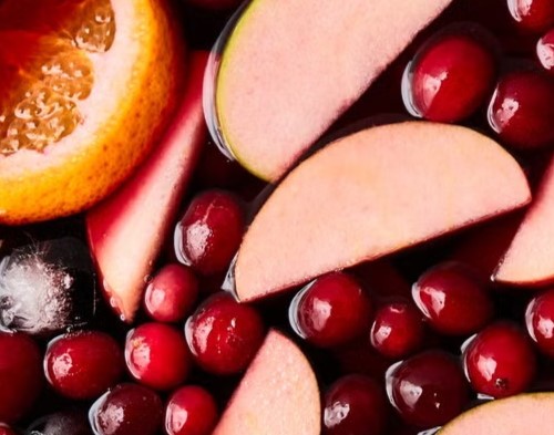 - Stir the mixture well, then add the sliced orange, apple, fresh cranberries, and pineapple chunks.