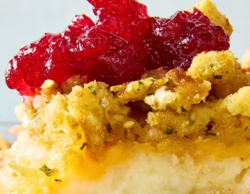 - Scrape the turkey mixture into a 13×9-inch baking dish. Dollop the mashed potatoes over the top and smooth with a spoon. Sprinkle cheese evenly over the potatoes, then scatter the stuffing over the cheese.