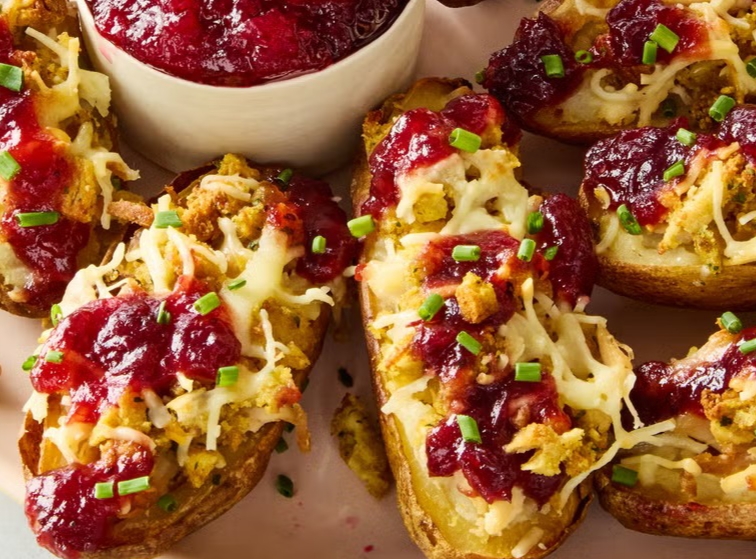 - To serve, arrange the potato skins on a platter, spoon a bit of cranberry sauce on top of each one, and garnish with sliced chives or scallions. Serve immediately.