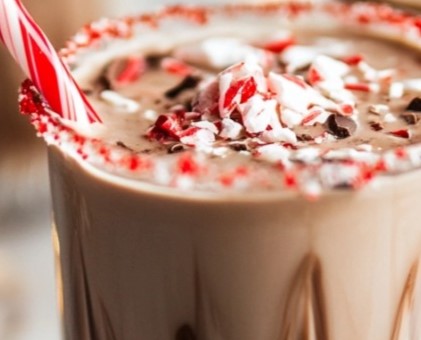 4. Strain into prepared glasses and garnish with extra candy canes or chocolate shavings if desired.