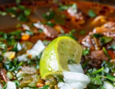 Serve birria as a stew in bowls topped with chopped cilantro and diced onion, with lime wedges on the side.
