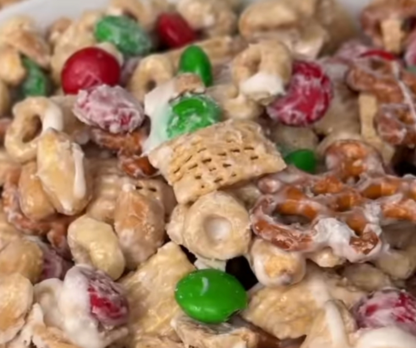 2. In a very large bowl, combine Corn Chex, Cheerios, pretzels, peanuts, and M&M’s. Gently toss to mix evenly.