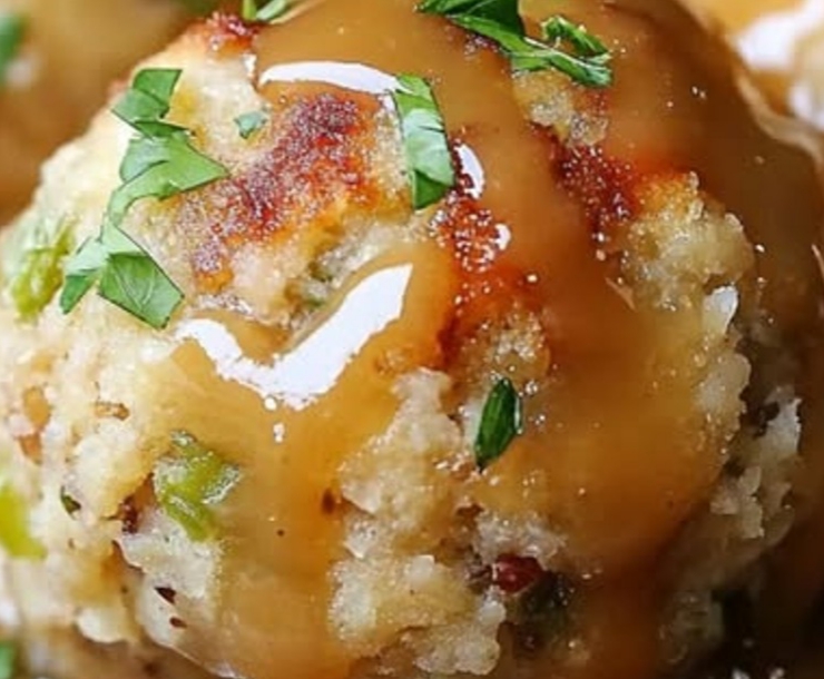 Serve the warm stuffing balls topped with homemade gravy.