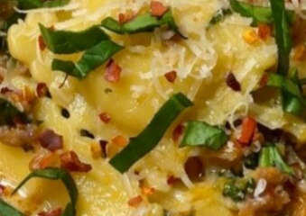 - Stir in garlic, add sausage, and cook until browned. Mix in Herbs de Provence and red pepper flakes.